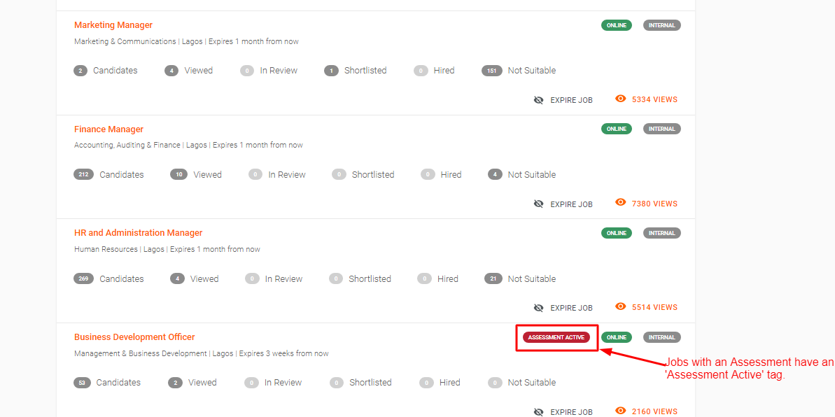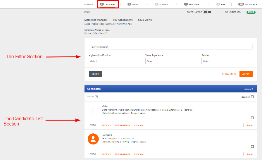 Candidates Tab: This tab shows the list of recently received applications, that you are yet to view. When you view an application (e.g the Profile), the application automatically moves to the Viewed tab.