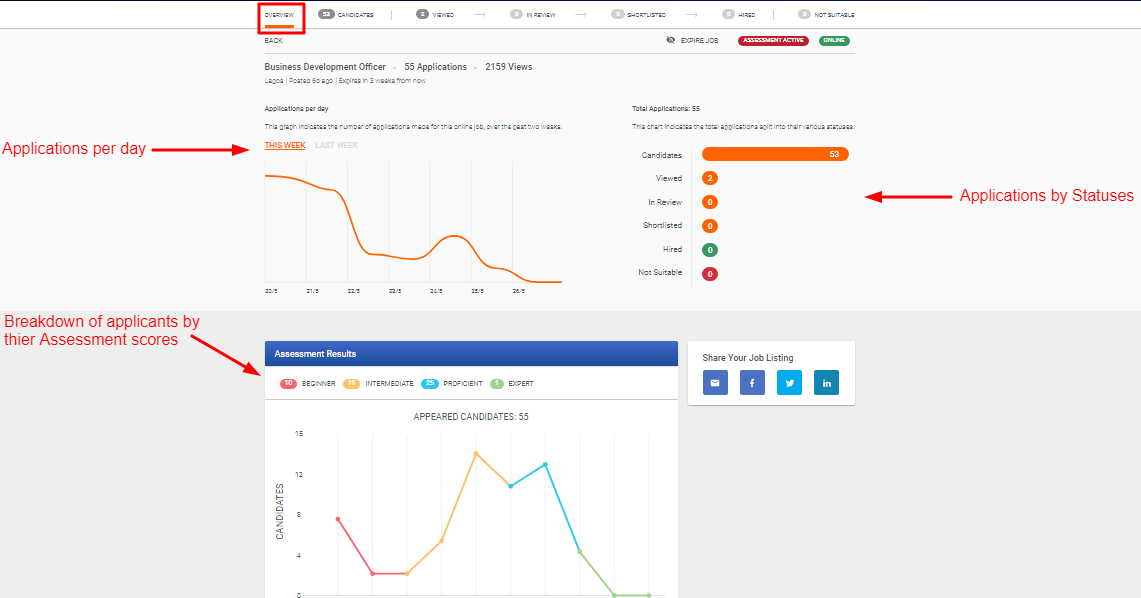 Overview Tab: This tab shows a summary of your applications. We show you the total applications per day, Applications split into their various statuses, and the breakdown of candidates by their assessment scores (for jobs with an assessment).