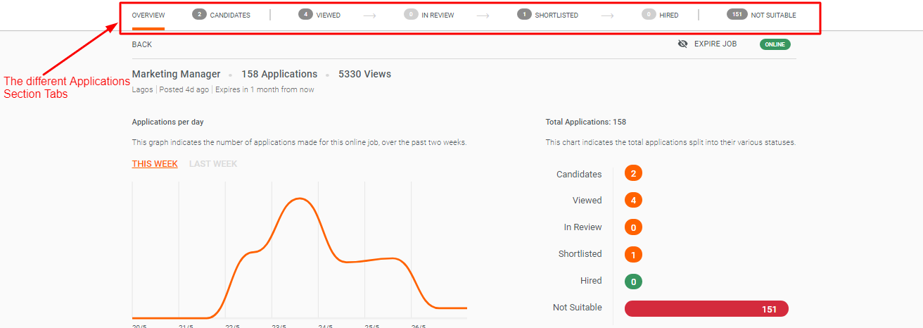 Within the Applications section, there are different tabs (sub-sections): Overview & Application Status Tabs - Candidates, Viewed, In Review, Shortlisted, Hired, Not Suitable.