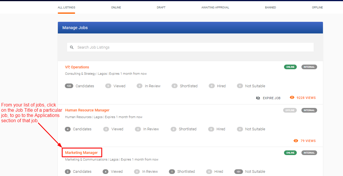 1. While logged in to your Jobberman Employer Account, click on Jobs at the top menu to view all your jobs.