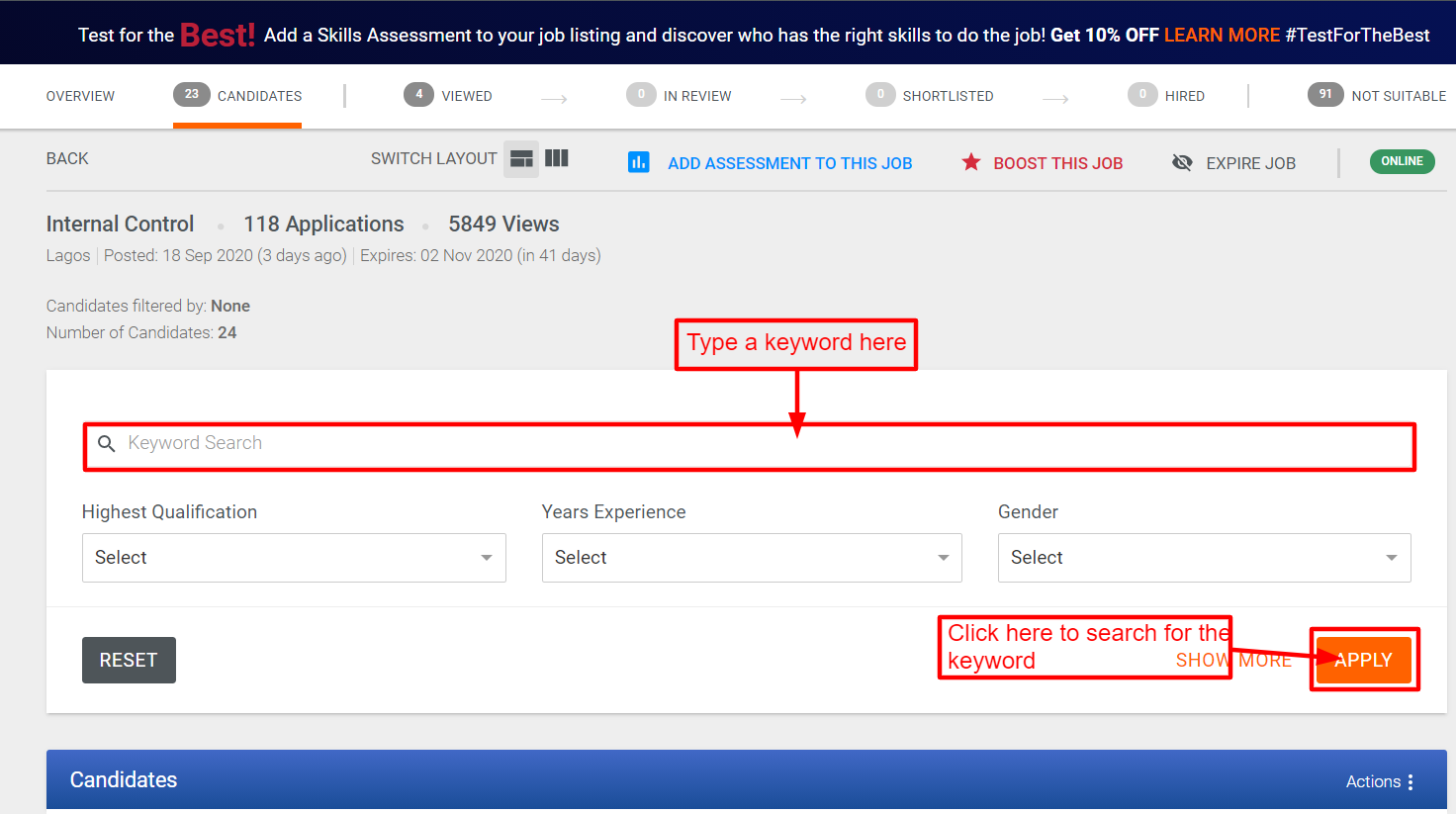 While in the All Jobs page, click on the Job Title which you wish to start shortlisting, so that you can redirected to the job details page to view the applications